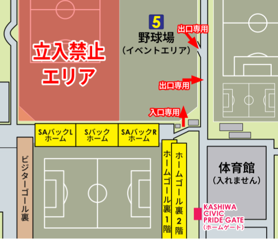 野球場イベントエリア、メインスタンド、柏熱地帯1Fコンコース、バックスタンド、ビジターエリア