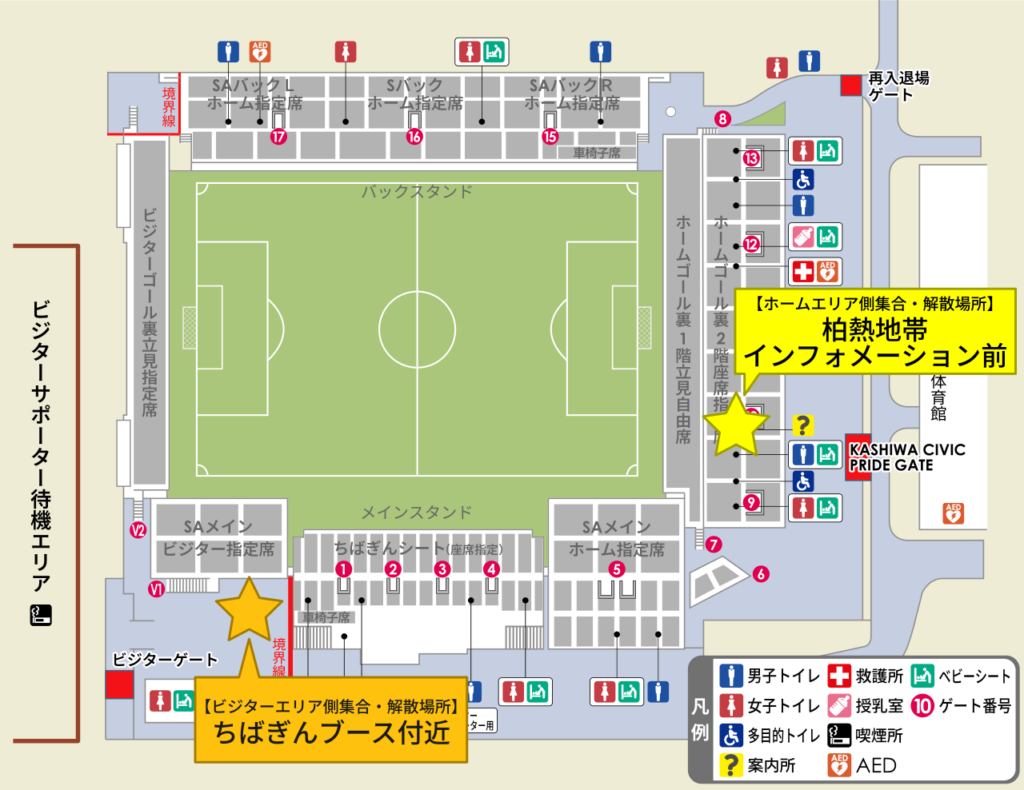 | 00:00~13:35 | 集合 | ホーム側:柏熱地帯下インフォメーション前 ビジター側:ビジター側ちばぎんブース付近 |
