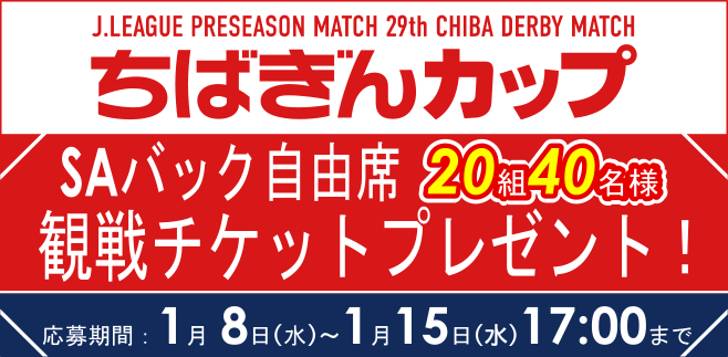2025年2月9日(日)フクダ電子アリーナにて開催される、2025 Jリーグ プレシーズンマッチ 第29回ちばぎんカップの『SAバック自由席』観戦チケットを抽選で20組40名様にプレゼントいたします!!応募方法や概要は下記をご確認ください。ぜひこの機会に、ご家族やご友人をお誘いあわせのうえ、ふるってご応募ください!!